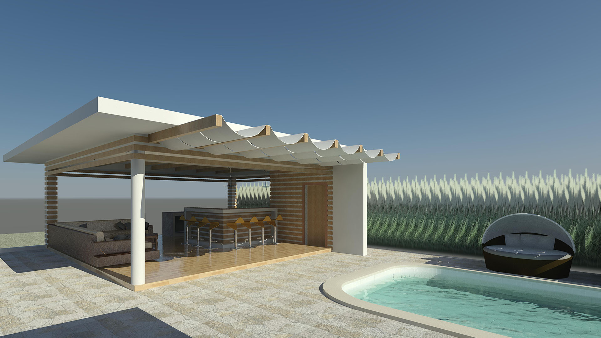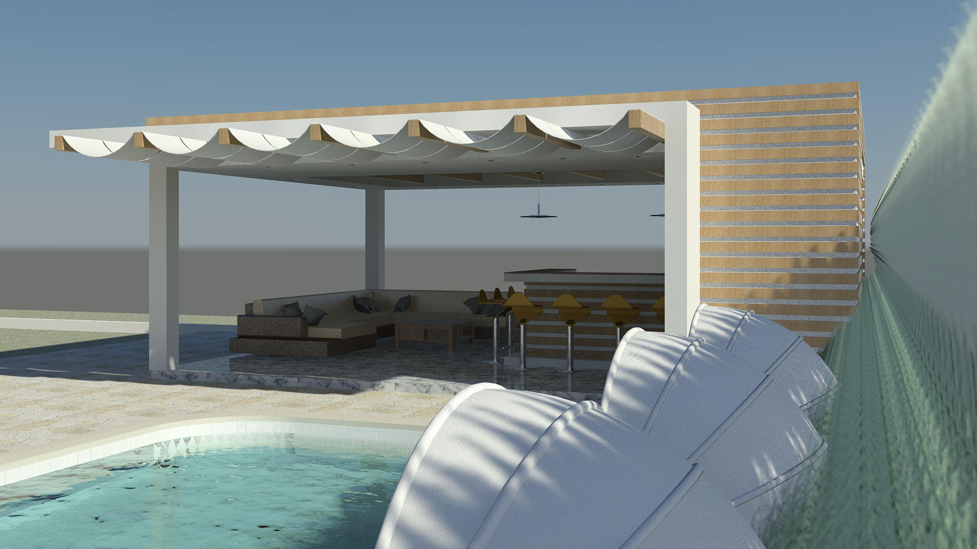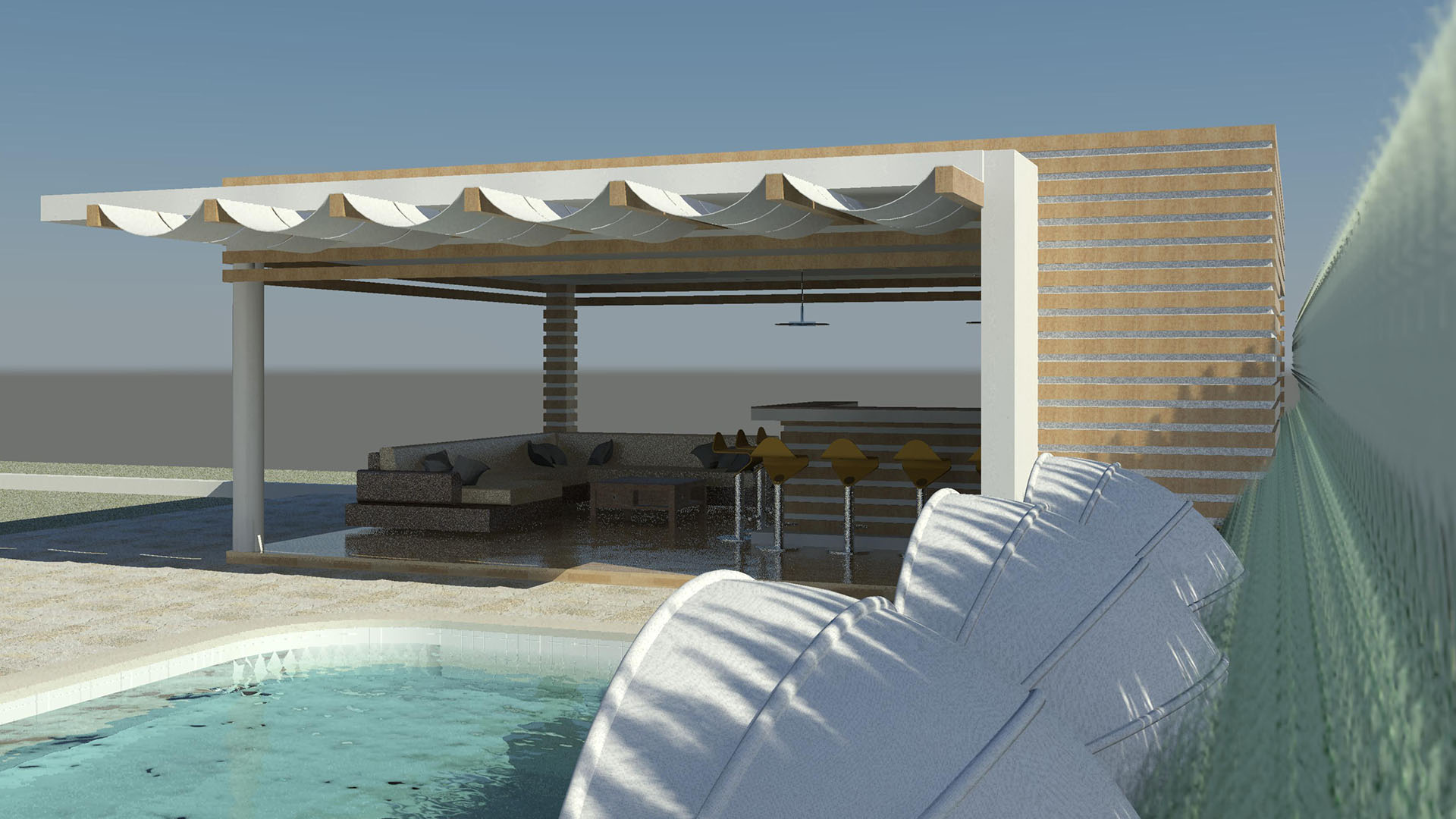 Dicha estructura se ha diseñado como un espacio familiar integrado en el área de la piscina de la residencia , y consta de un área de Bar-Cocina, áreas de Estar, medio Baño.