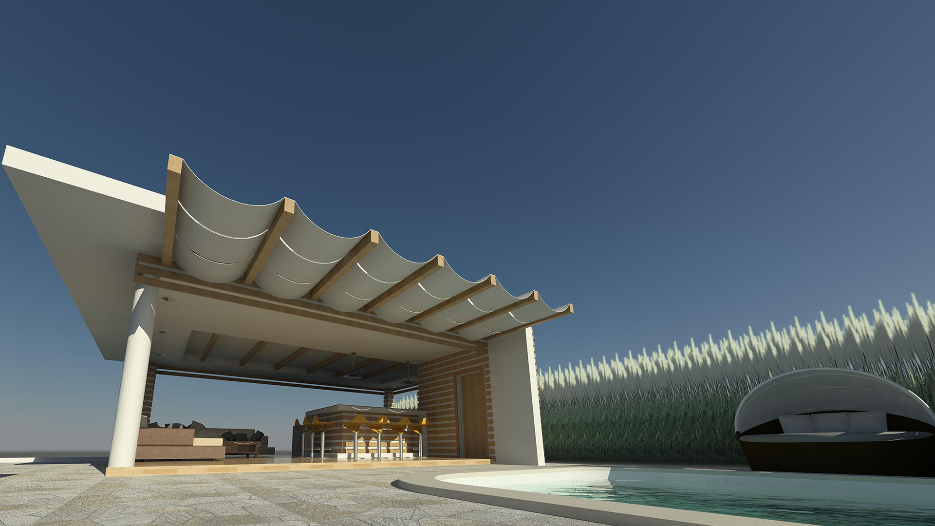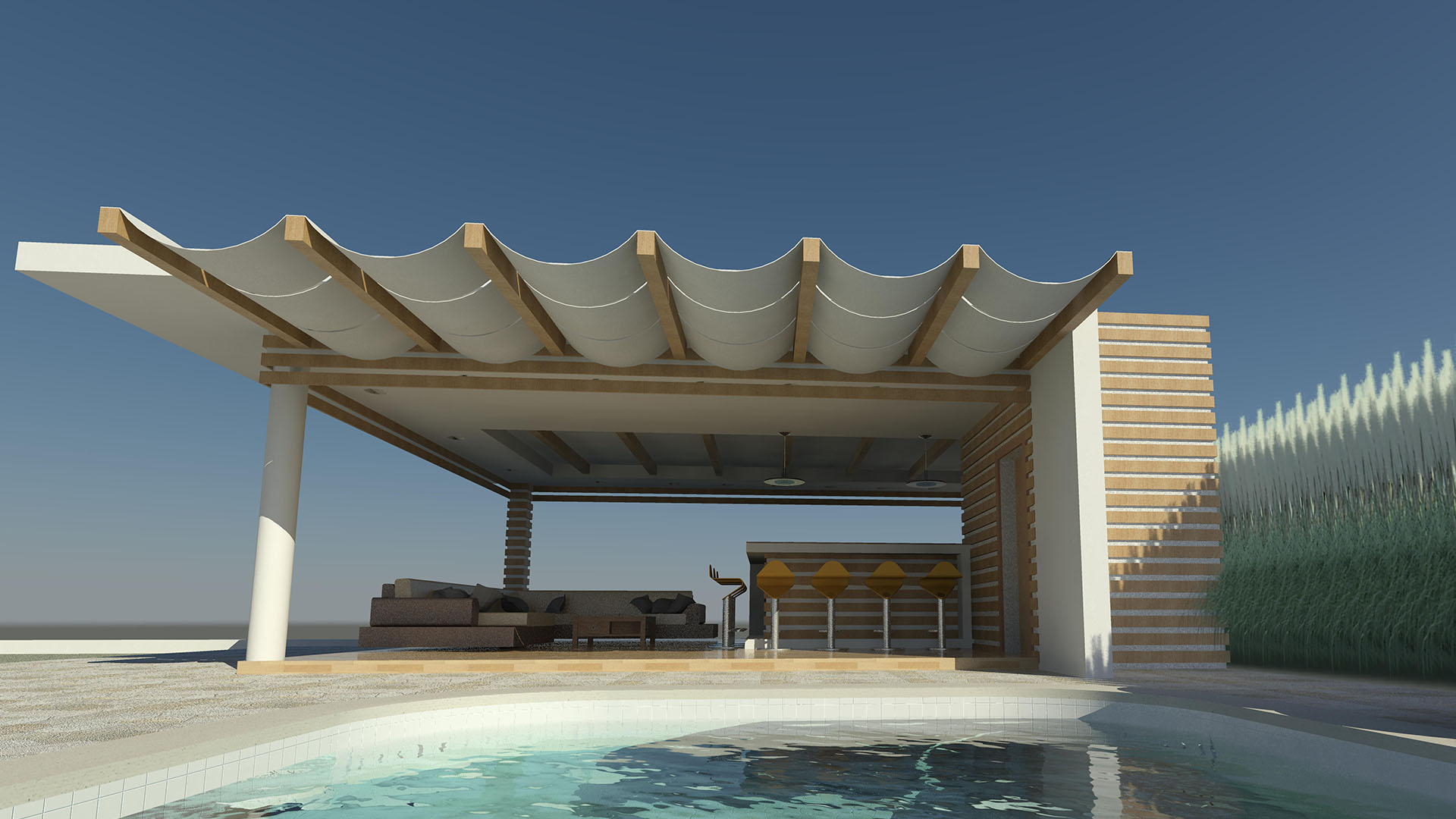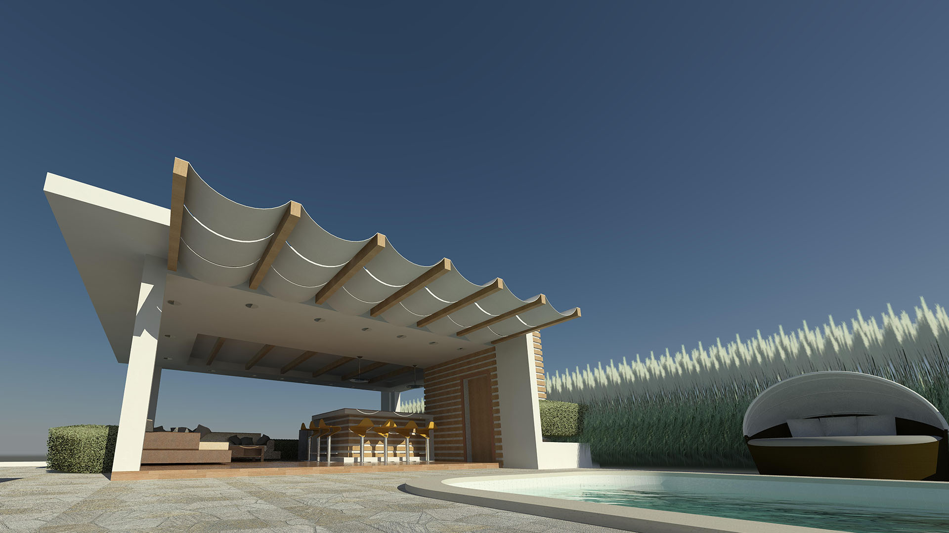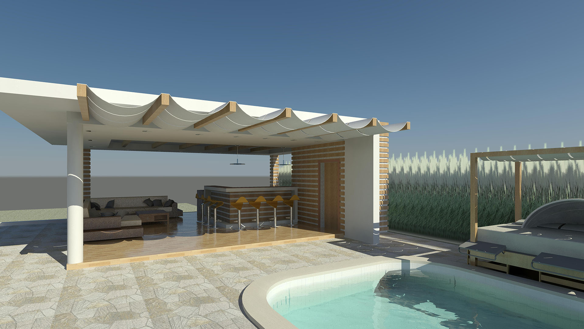 Dicha estructura se ha diseñado como un espacio familiar integrado en el área de la piscina de la residencia , y consta de un área de Bar-Cocina, áreas de Estar, medio Baño.